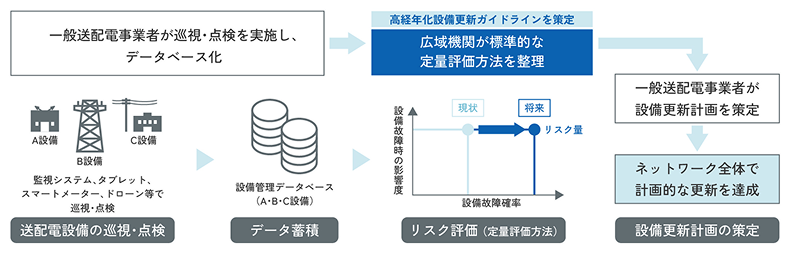一般送配電事業者1 0社共通の標準的な設備リスク評価方法を示した「高経年化設備更新ガイドライン」を策定しました。各一般送配電事業者においては、このガイドラインに従い、各設備のリスク量( 設備の故障確率×故障影響度)を評価した上で、そのリスク量や施工力等を踏まえて設備の更新量を算定し、設備更新計画に反映しています。