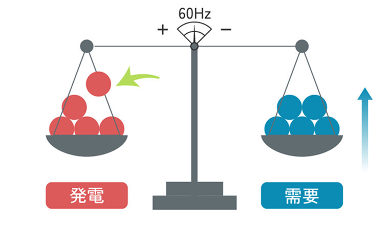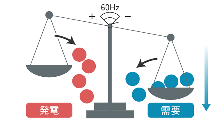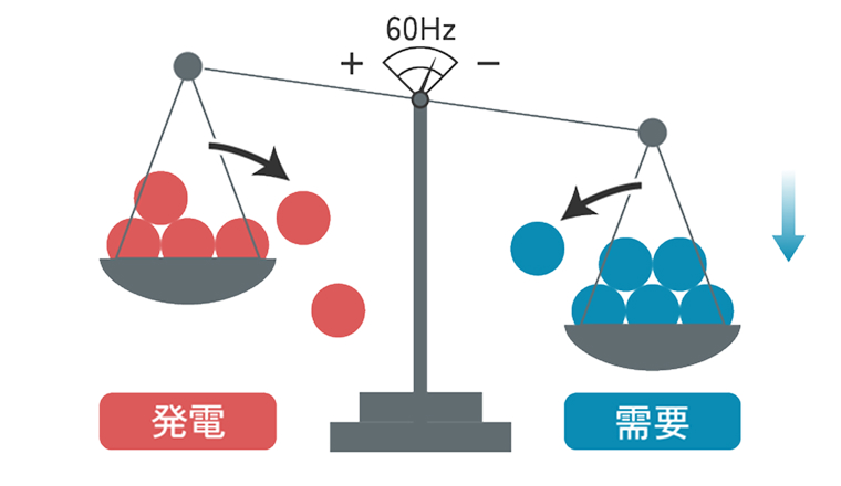 電力を安定して供給するためには、電気を消費する量(需要)と電気を生み出す量(発電量)のバランスを常に一致させる必要があります。一般送配電事業者が実際の需要の変動に合わせて、24時間365日、発電量を調整し需給バランスを維持しています。需給のバランスが崩れると、周波数が乱れ、発電所の発電機や工場の機器などに悪影響を及ぼすことになります。