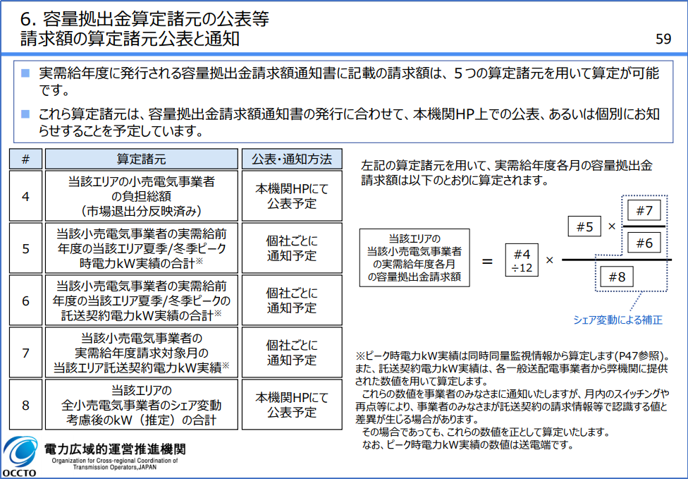 また、小売電気事業者の皆様へ発行する請求額通知書に記載の容量拠出金請求額は、5つの算定諸元※を用いて算定いたします。