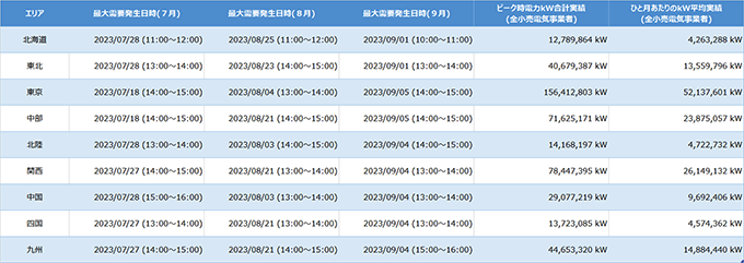 2023年度の需要実績に基づく、各エリアの夏季における最大需要発生日時及び全小売電気事業者のピーク時電力kWは以下の通りです。