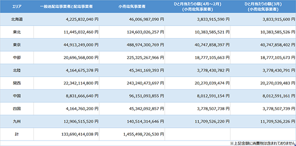 2024年度を実需給年度とする容量拠出金総額として、仮請求額の算定では、2023年5月10日に公表しているエリア毎の契約締結総額(経過措置控除後)を元に算定を行います。エリア毎の一般送配電事業者・配電事業者の負担総額及び小売電気事業者の負担総額は以下の通りです。