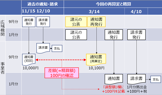• 再算定による精算額(税抜)が「調整額」の欄に記載されます。