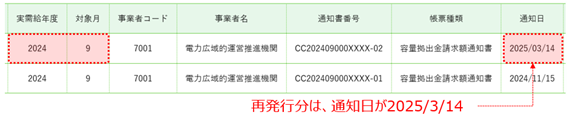 • 初回発行分と再発行分(対象月の合計)の差額が、2025年1月分(2024年度1月分)での容量拠出金との精算額(税抜)となります。
