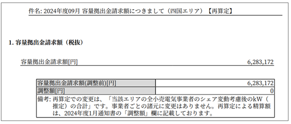 容量市場 容量拠出金(2024年9・10・11月分)の再算定と精算の実施について