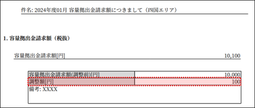 請求書が発行されましたら、2025年1月分(2024年度1月分)の請求額通知書に記載の「容量拠出金請求額[円]」と、請求書に記載の「税抜金額(円)」の金額が一致していることをご確認ください。