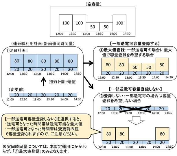 「一部送電可容量登録しない」を選択した場合、全ての時間帯が変更前の値とはならず、送電可となった時間帯は送電可能な最大値で、一部送電可となった時間帯は変更前の値で容量登録されますので、ご留意いただけますようお願いいたします。