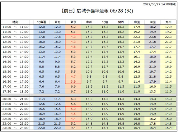 広域予備率の公表について<東京電力パワーグリッドの供給区域>(対象日:6月28日(火))