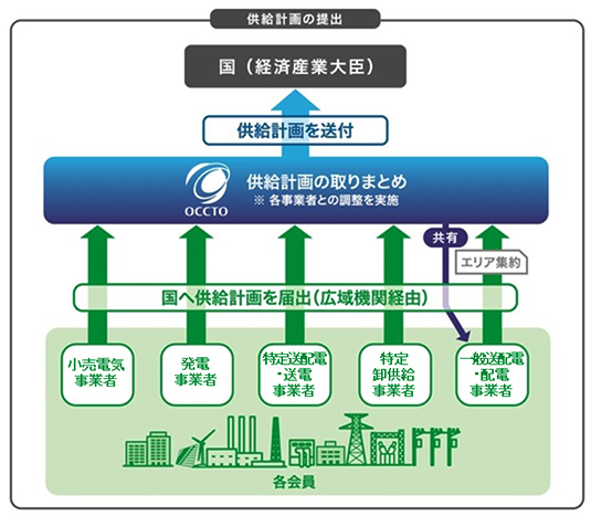 供給計画とは、今後10年間の需給見通し、発電所の開発や送電網の整備等をまとめた計画で、電気事業法第29条の規定に基づきすべての電気事業者は国に届け出る義務があります。広域機関が供給計画を取りまとめることにより、短期から中長期までの全国・供給エリアの需給バランスを一元的に把握・評価しています。